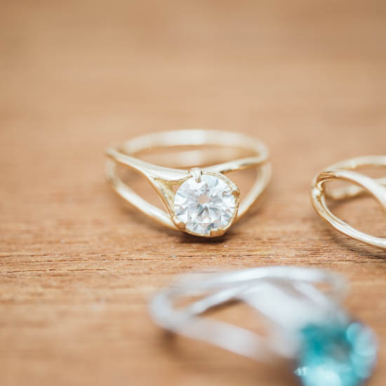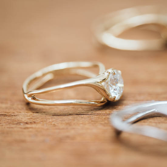 A striking semi-one-off ring featuring a Moissanite gemstone, finished in 18K Yellow Gold.