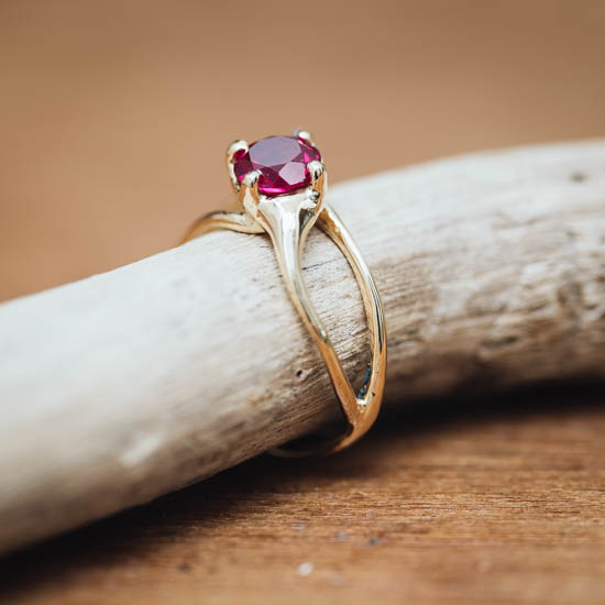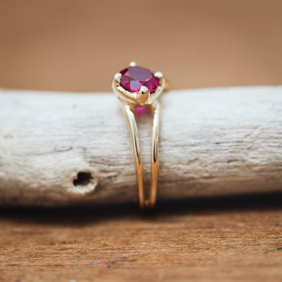 A striking semi-one-off ring featuring a lab-grown ruby gemstone, finished in 18K Yellow Gold.